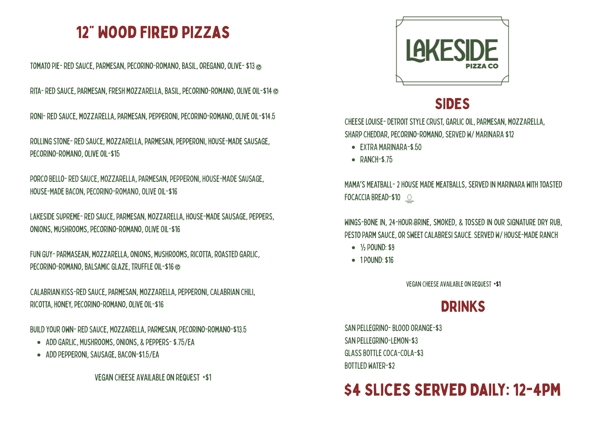 At Lakeside Pizza Co., we believe in keeping things simple and executing them exceptionally well. We're a small, take-out-only pizzeria where the flavors of Italy meet the relaxed rhythm of lake life.